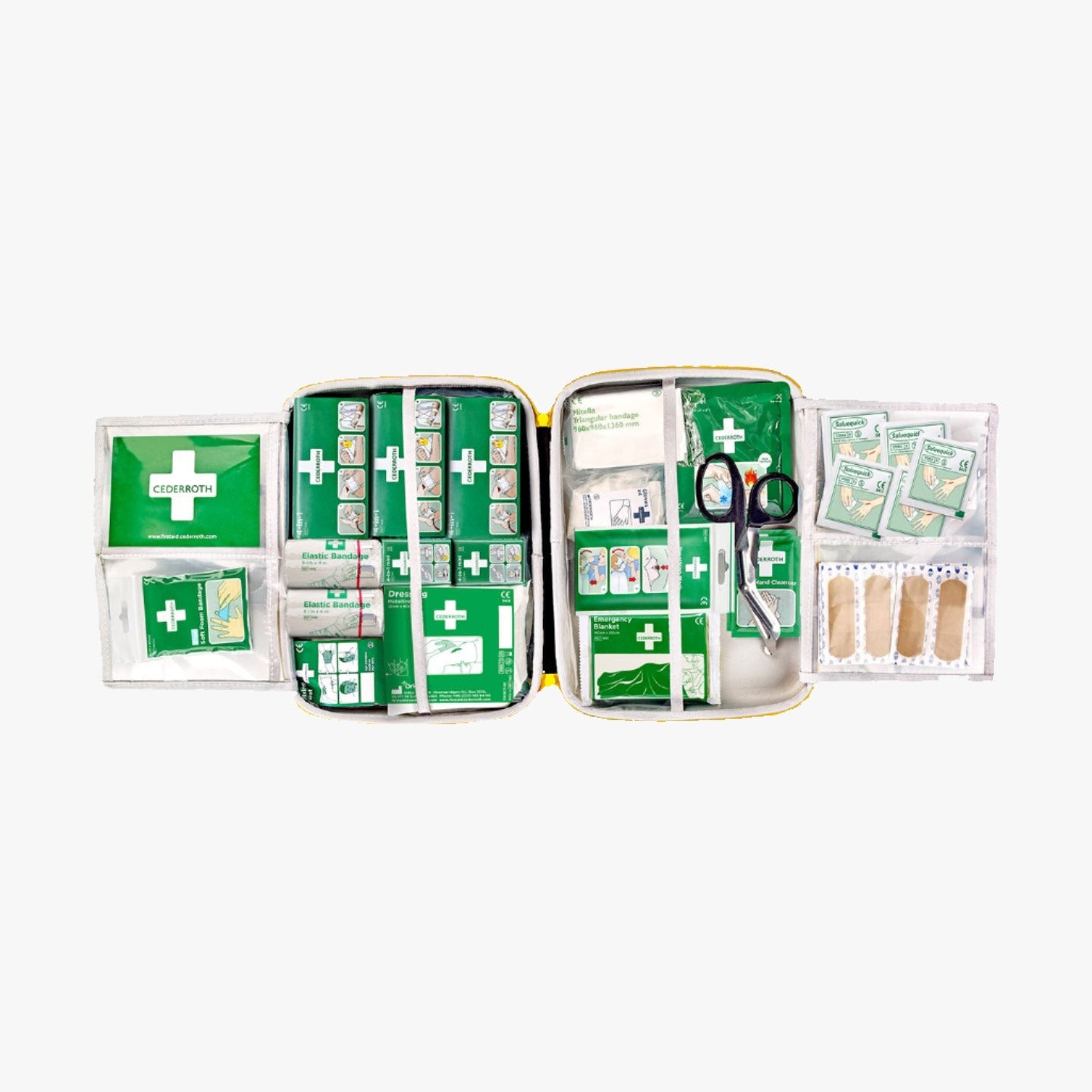 En välutrustad Första Hjälpen-väska konstruerad i ett gummiliknande material med matt yta för att hålla damm, fukt och smuts utanför. Utrustningen hålls hygieniskt ren och är alltid redo att användas. Produkterna är packade i transparenta plastfickor för tydlig översikt och det är lätt att hitta rätt produkt när varje sekund räknas. Alla produkter är försedda med tydliga självförklarande instruktioner. Signalfärger i grönt och gult gör väskan synlig på långt håll.