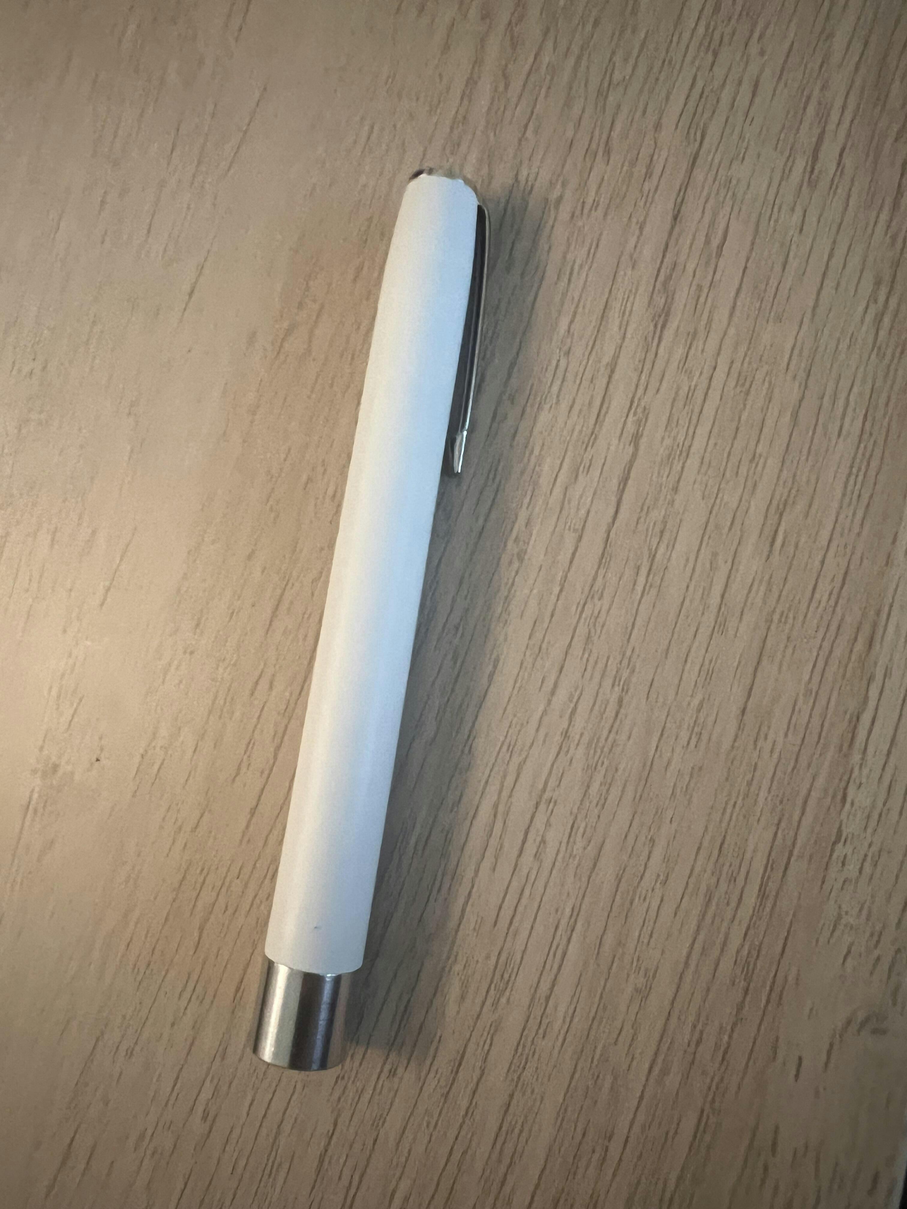 Pennlampa för neurologisk undersökning av patient och som enklat kan bäras i bröstfickan i dina arbetskläder. På sidan av pennan finns markering för pupillstorlek, skala 2 till 9 mm. På andra sidan finns avstådsmätare som visar 0 till 50 mm.