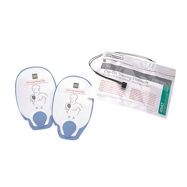 Elektroderna är formgjutna för LifePak 500 Trainer och LifePak 1000 Trainer — de är inte kompatibla med skarpa hjärtstartare eller andra övningsdockor. Om du tränar med flera olika tränarmodeller behöver du separata elektrodset för varje märke. Ett 5-pack med kabel och förvaringspåse ingår.