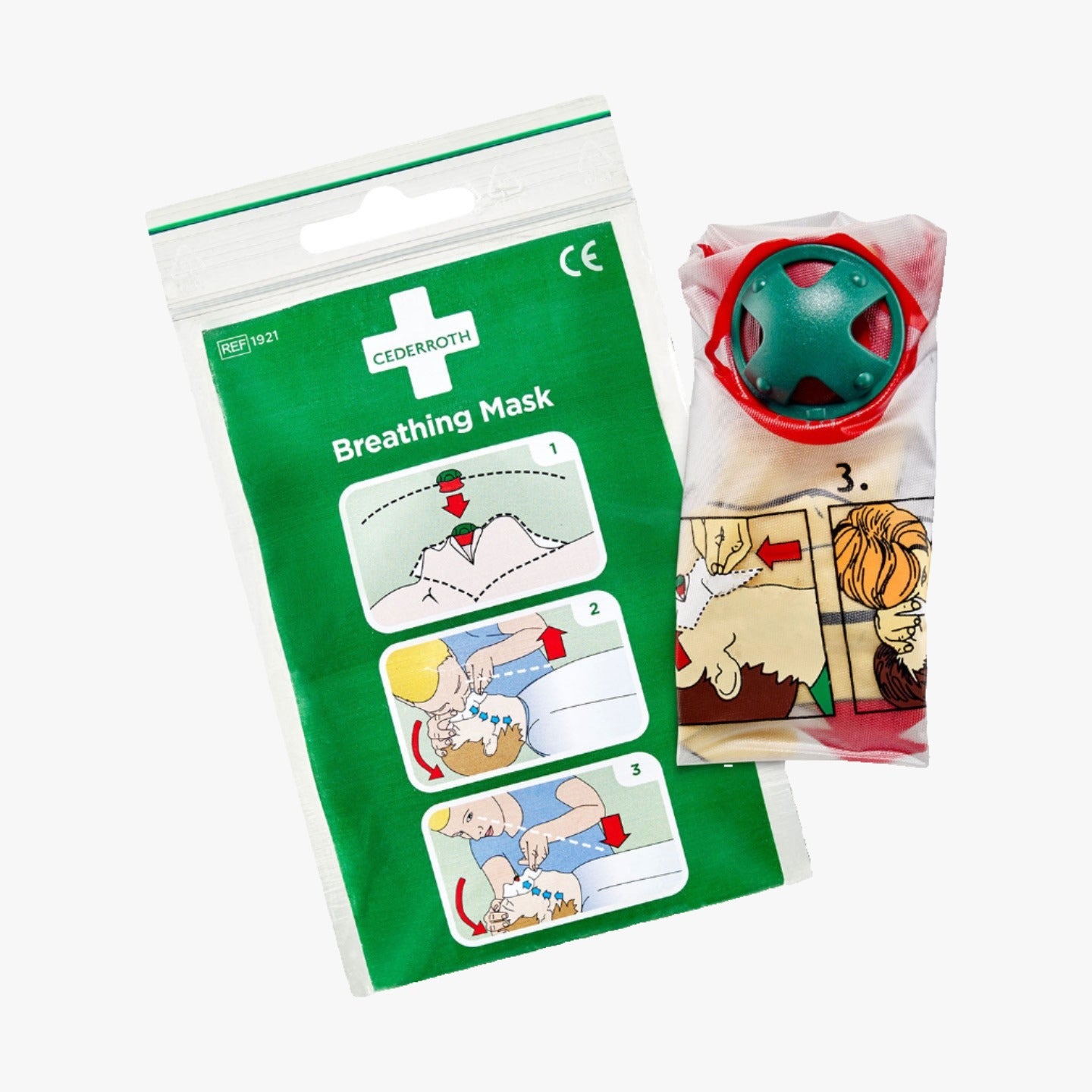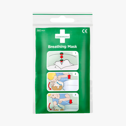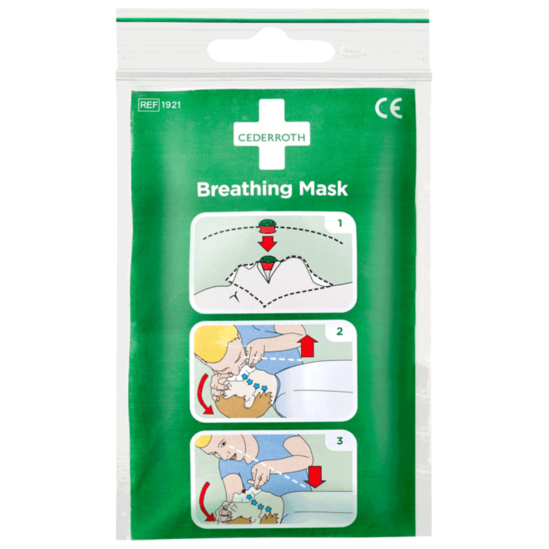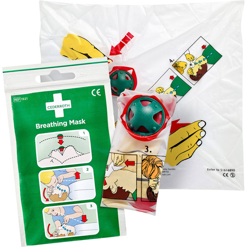 Cederroth Andningsmask är ett hjälpmedel för att ge mun-till-mun-andning på rätt sätt samtidigt som det minskar risken för kontakt mellan hjälpare och skadad. Andningsmasken består av en plastduk med backventil. Tydliga instruktioner är tryckta direkt på duken. På plastduken finns tydliga instruktioner för mun-mot-mun-metoden och hur masken ska placeras över den skadades ansikte. Backventilen signalerar vilken sida som skall placeras upp mot hjälparen (grön) respektive ned i den skadades mun (röd). Plastdukens storlek minskar risken för att hjälparen kommer i kontakt med blod eller uppkastningar från den skadade. Munstyckets utformning tvingar hjälparen att gapa stort och pressa sina läppar runt den skadades mun så att det sluter tätt. Backventilen har stora hål vilket minskar motståndet och underlättar för hjälparen att orka genomföra ett längre pass konstgjord andning.