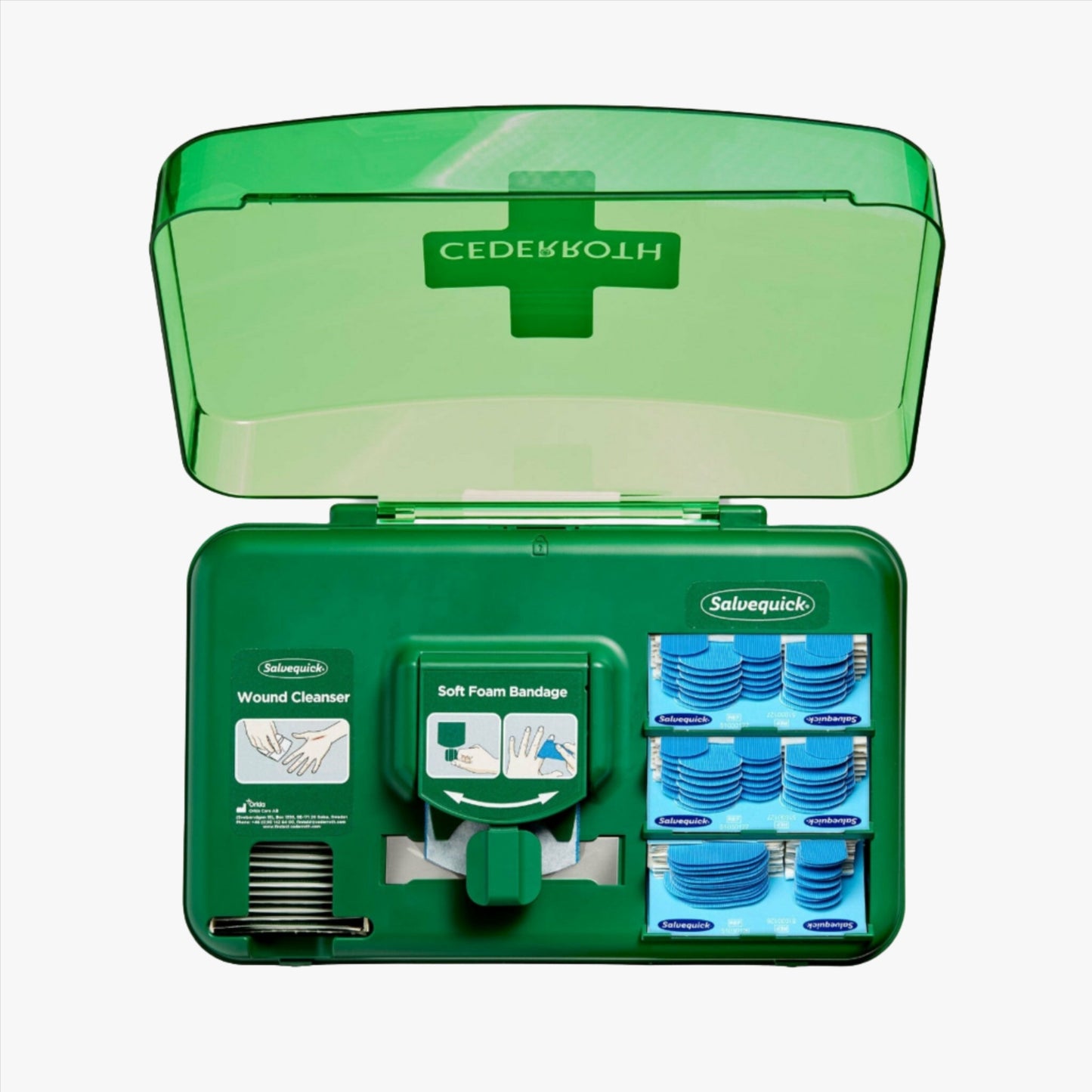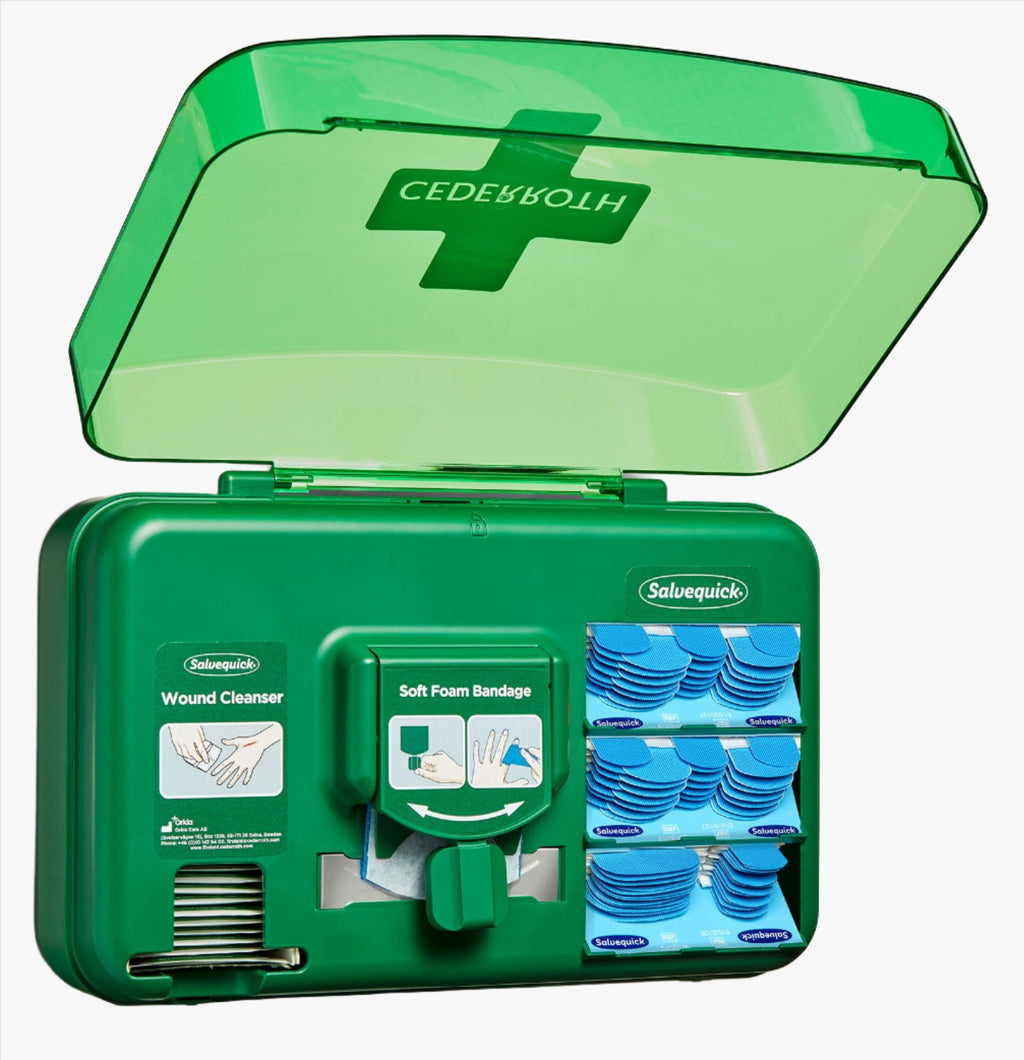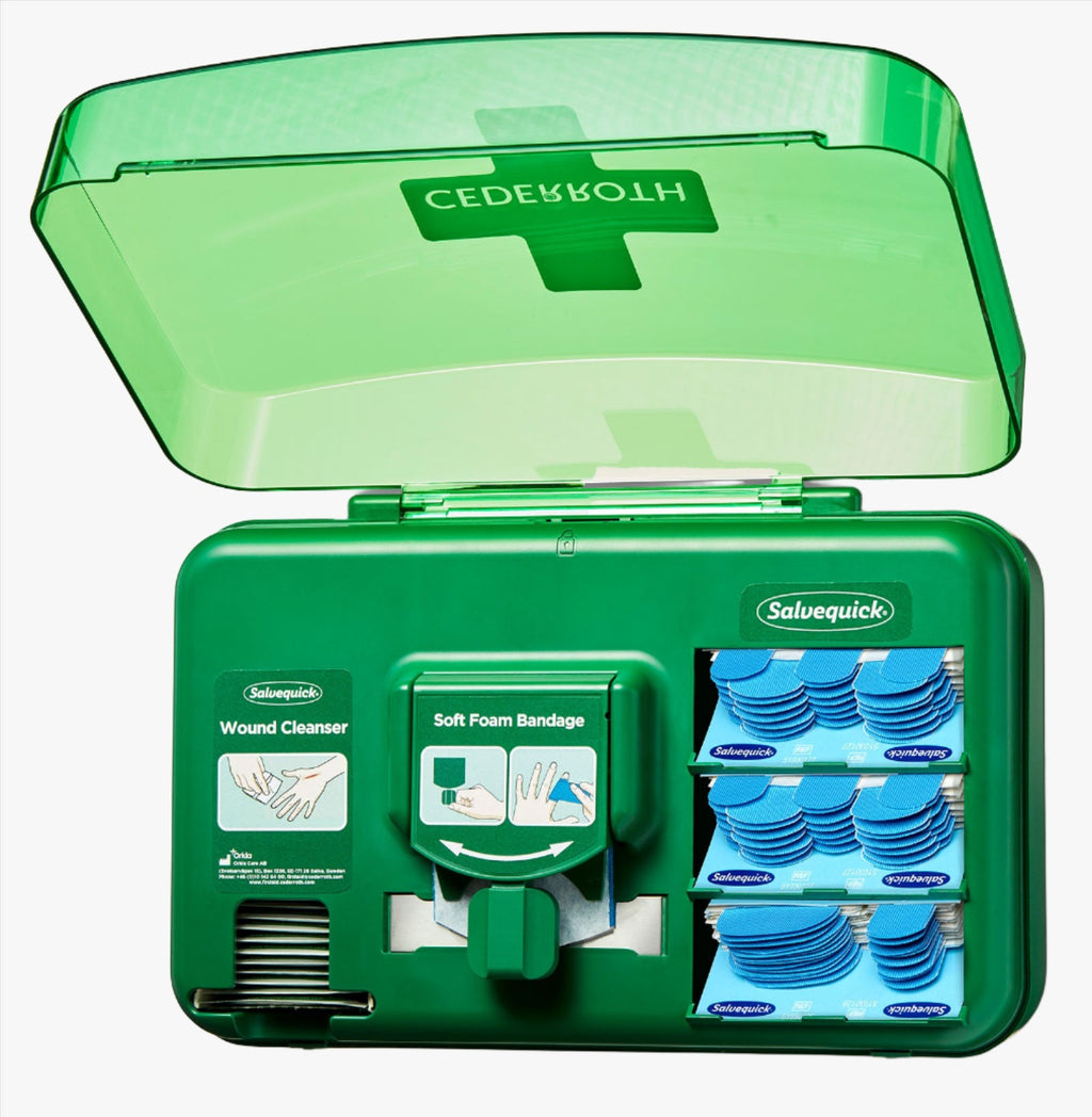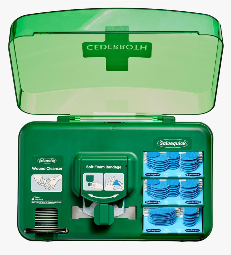 Cederroth Wound Care Dispenser Blue. Det mesta du behöver för att ta hand om mindre sårskador i en praktisk dispenser. Wound Care Dispenser Blue är ett smart komplement till Första Hjälpen-stationen och placeras där du löper stor risk att få skärsår. Innehåller Soft Foam Bandage Blue ett självhäftande, limfritt plåster som sitter kvar även i vatten. Dispensern innehåller även Sårtvättare samt en större mängd plåster i olika storlekar. Innehållet hålls fräscht bakom den dammskyddande luckan. Fylls på med hjälp av den medföljande refillnyckeln.
