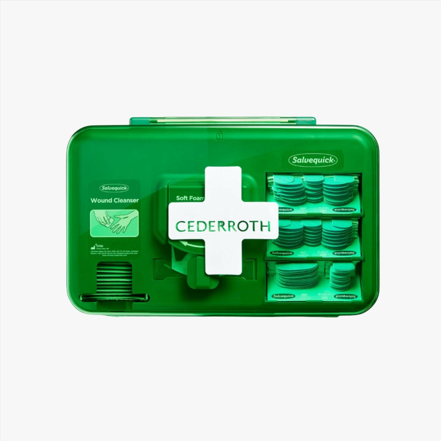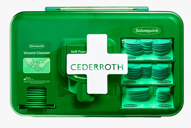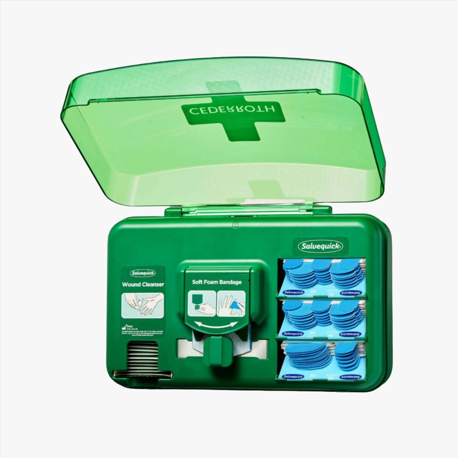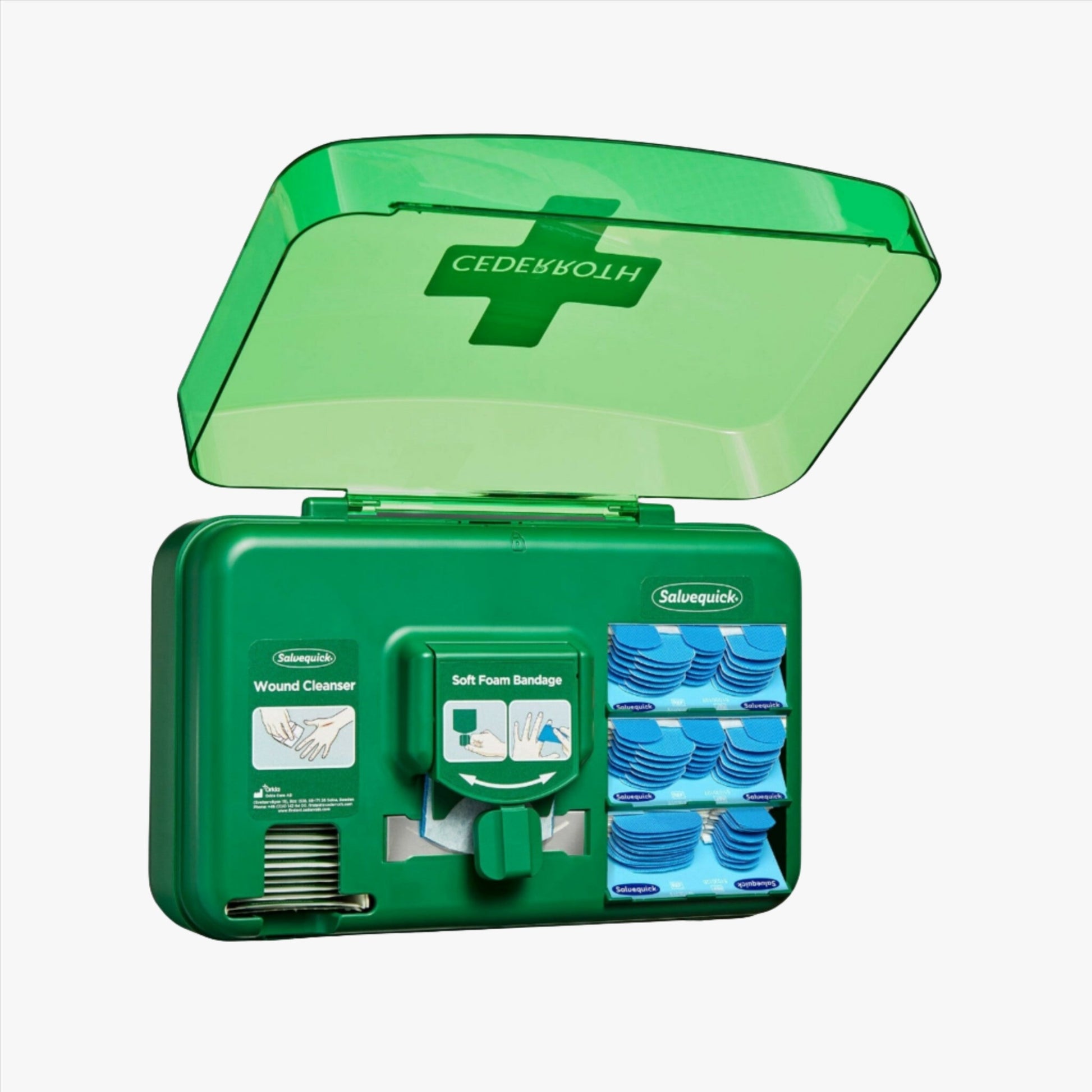 Cederroth Wound Care Dispenser Blue. Det mesta du behöver för att ta hand om mindre sårskador i en praktisk dispenser. Wound Care Dispenser Blue är ett smart komplement till Första Hjälpen-stationen och placeras där du löper stor risk att få skärsår. Innehåller Soft Foam Bandage Blue ett självhäftande, limfritt plåster som sitter kvar även i vatten. Dispensern innehåller även Sårtvättare samt en större mängd plåster i olika storlekar. Innehållet hålls fräscht bakom den dammskyddande luckan. Fylls på med hjälp av den medföljande refillnyckeln.