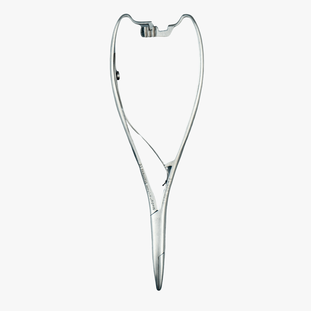 Mathieu nålhållare skiljer sig från Mayo-Hegar i sitt utseende. Dess form är modernare och den har två böjda armar. Detta gör instrumentet mycket lättare och lättare att hantera.