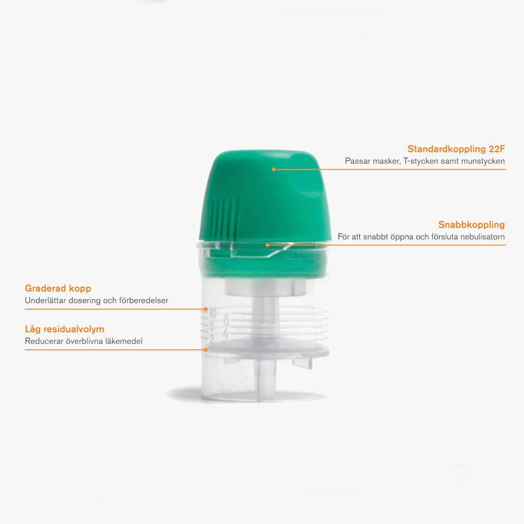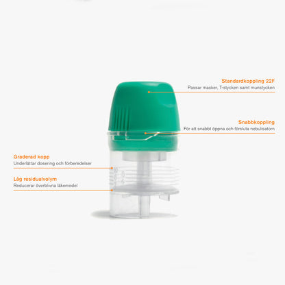 Enkelt handhavande. Skruvlock. Graderad skala i ml. Farmaka kan ej fastna i gängorna på inhalator. Effektiv nebulisering under lutning upp till 90°. Tål tryck upp till 80 cm H2O. Optimal partikelstorlek för bästa deponering av läkemedel- MMAD 2,7 mikrometer. 99,5% av dropparna är mindre än 5 mikrometer. 78,5 % av läkemedelsvolymen utgörs av partiklar mellan 1-5 mikrometer. Nebuliseringsmängd: 0.3-0.35 ml/min. Rekommenderat flöde 6-8 l/min. Drivgas O2 eller luft beroende på patientens tillstånd. För en-p atientsbruk.