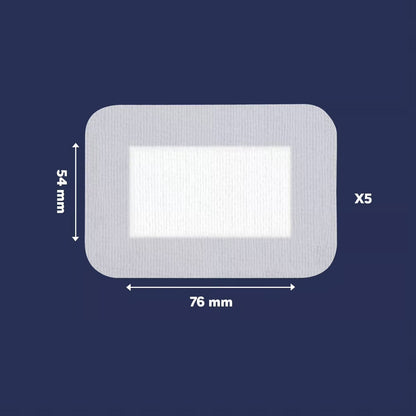 Plåstret mäter 76x54 mm och är sterilt förpackat. Materialet inkluderar polyester, non-woven, polyakrylat och viskos/polypropylen med ett nät av polyetylen. Plåstren bör bytas dagligen för att säkerställa att såret hålls rent och för att främja en snabbare läkningsprocess.