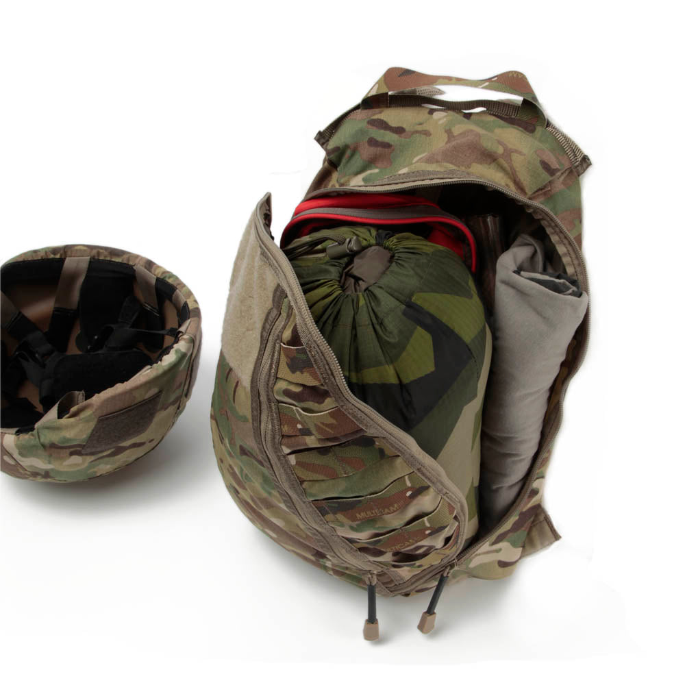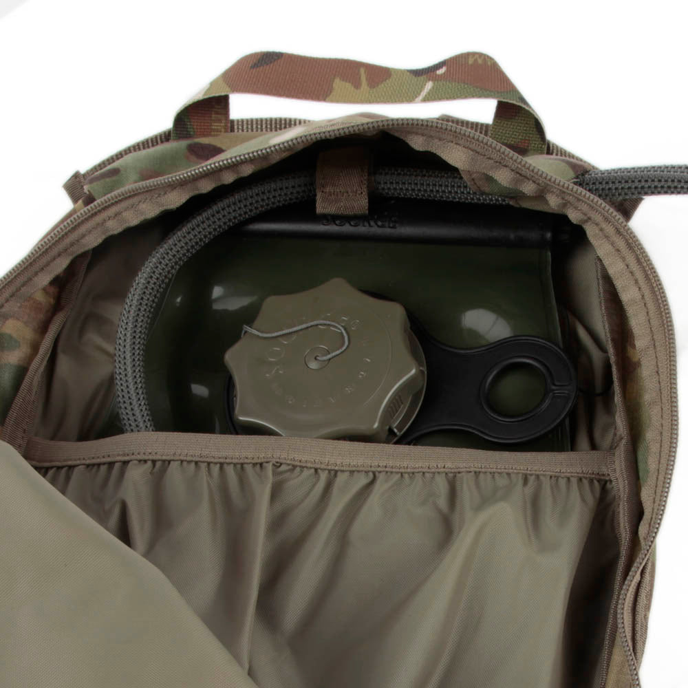 Inside attachment for a hydration system, with drinking tube ports on both sides of the pack. A full sized inner pocket for the bladder or any other items that are to be separated from the main compartment. A large zipped pocket covering the whole back. MOLLE webbing for additional pouches etc.