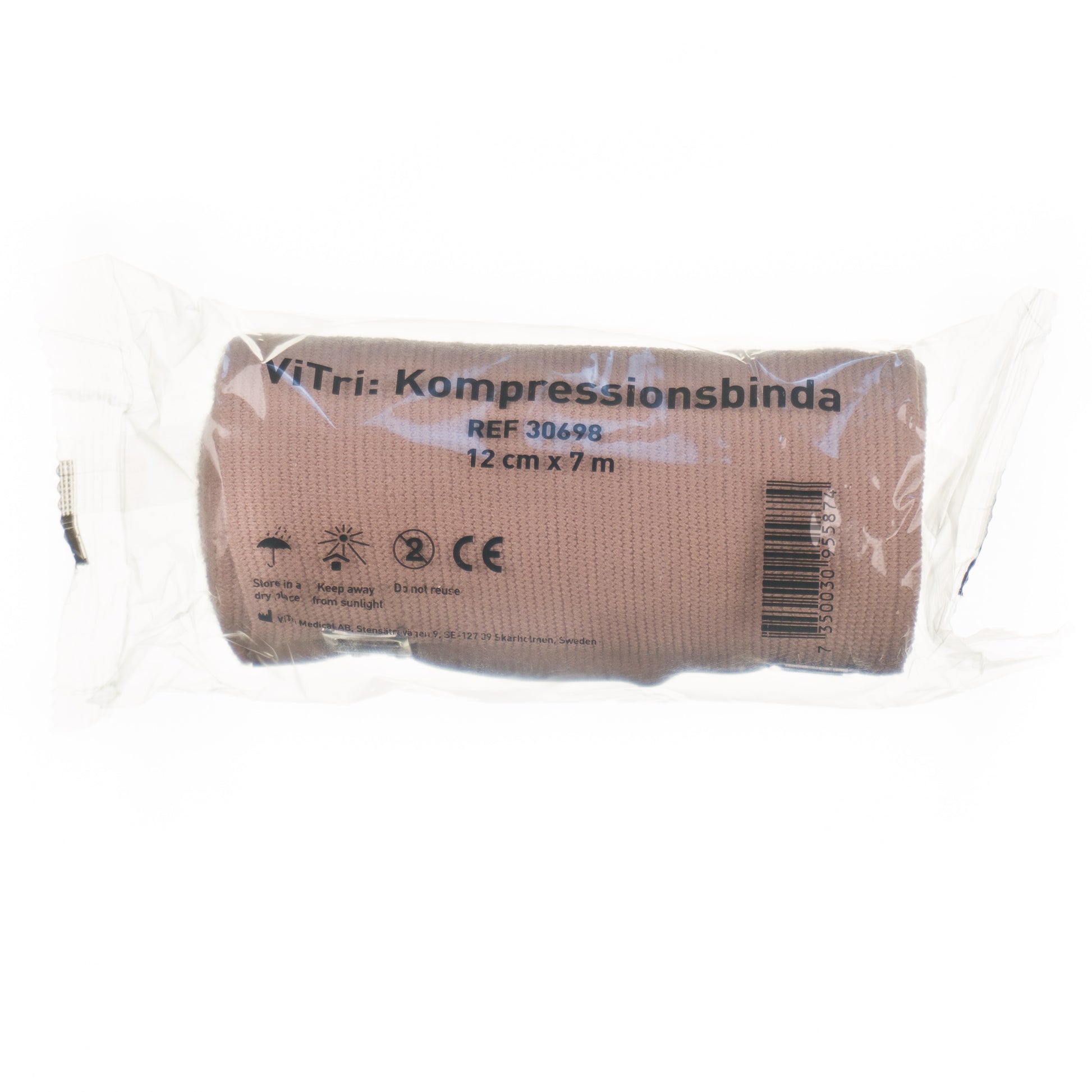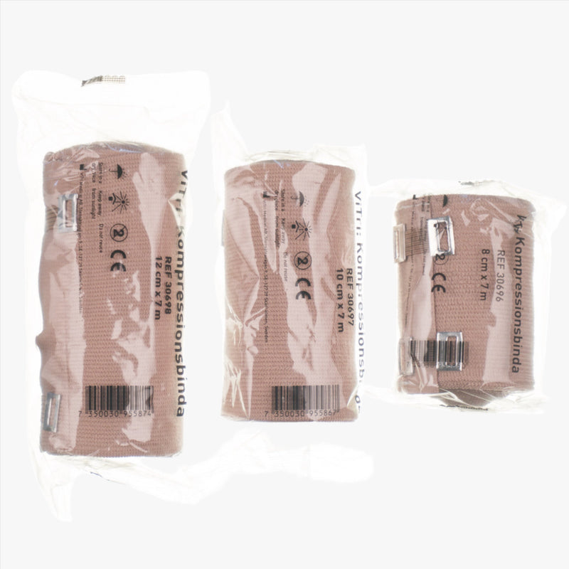 Elastisk binda från Vitri som mäter 10 cm x 7 m. Ger god kompression och används för att bland annat behandla stukningar och muskelbristningar eller för att förebygga dessa skador.